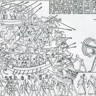 エジプト、ラムセス三世のレリーフに描かれた「海の民」との闘い:ウイキより